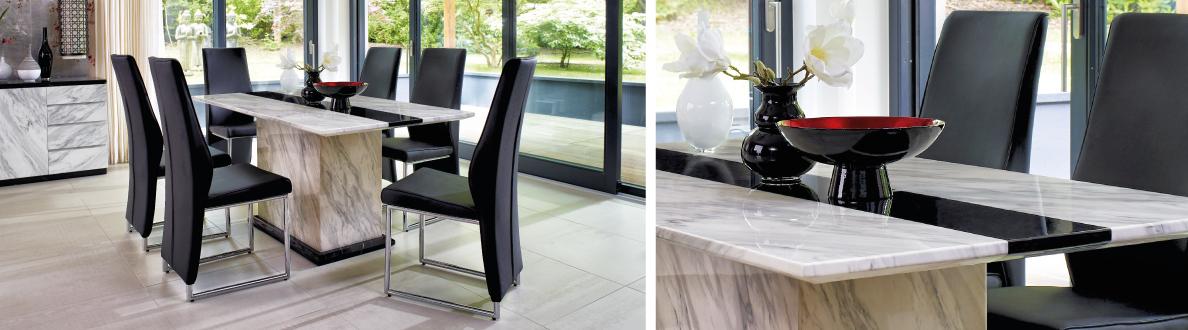 The Mont Blanc dining collection in luxurious marble is a sophisticated, contemporary choice. The design is clean and minimal with a fashionable two-tone design. The tops are crafted from the finest solid Volakas marble, with black Marquina marble effect panels providing a striking contrast. Choose high end style and glamour, and dine in real grandeur.